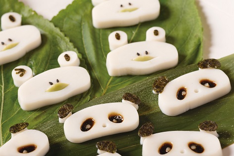 ③蒲鉾を1mm程度に薄くスライスし、ストローで抜いて目を作り、端切れで鼻の穴を作る。