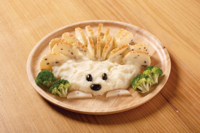 ②茹でたジャガイモを潰してマヨネーズで和え、お皿に盛りつける。